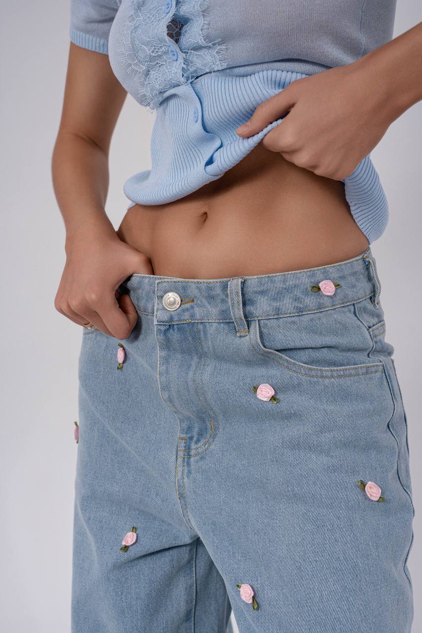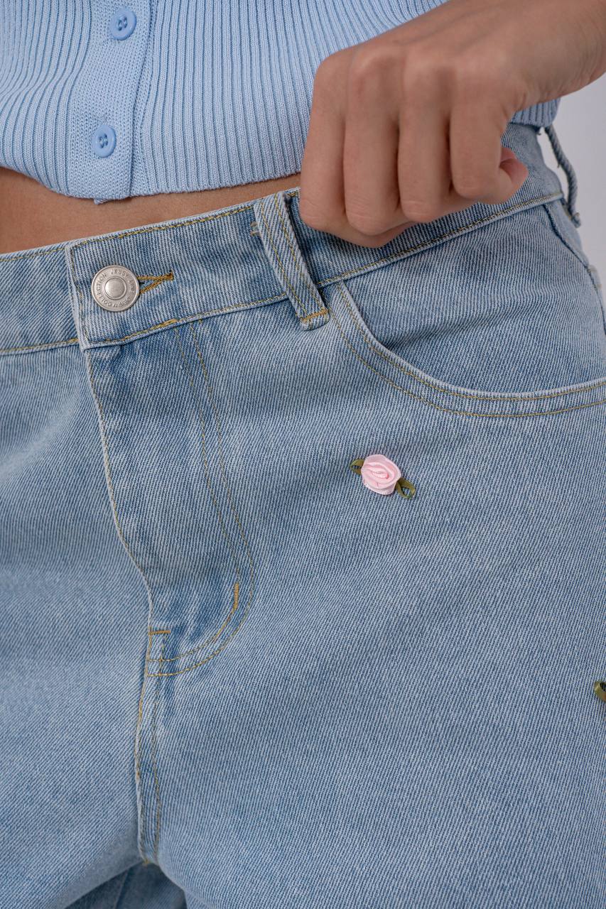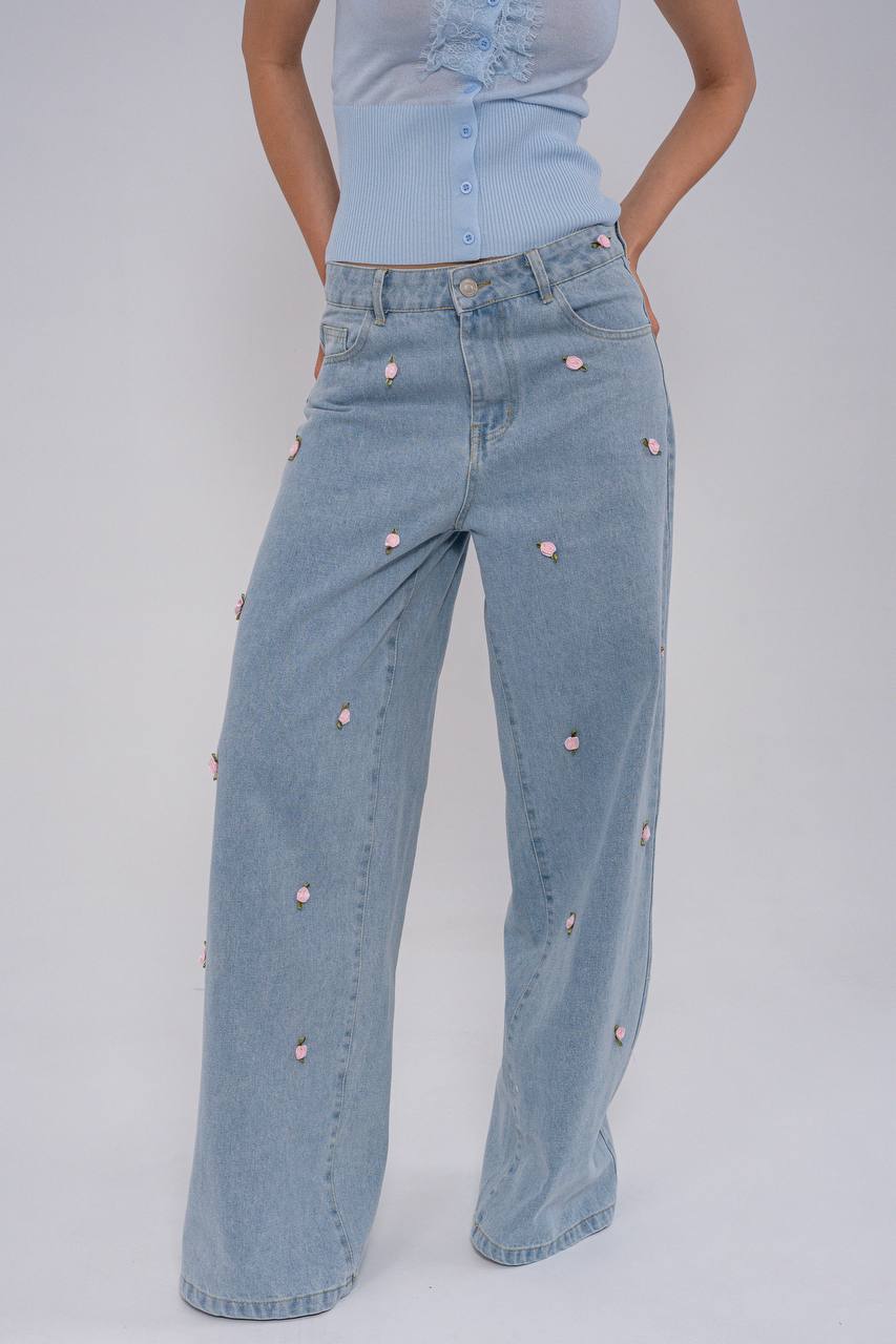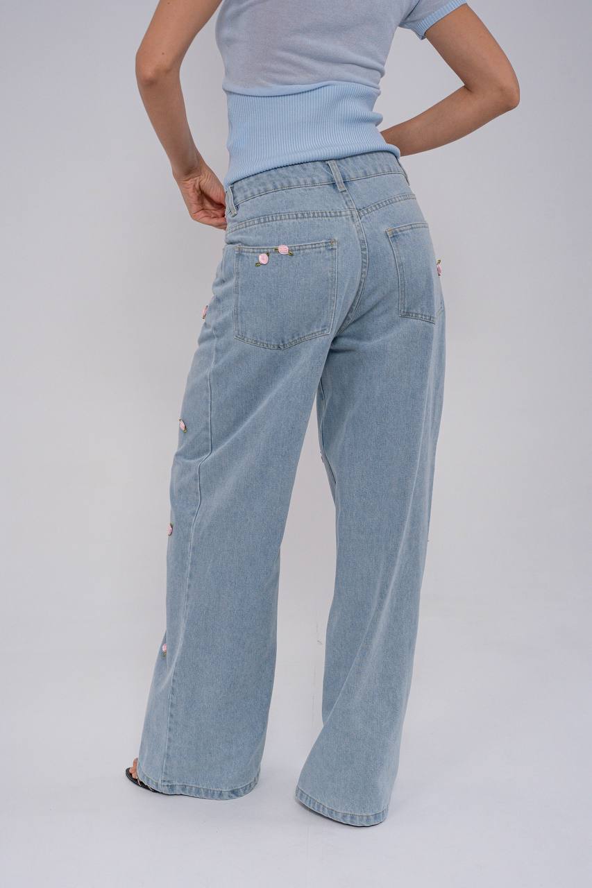 Джинсы широкие , голубые ,с нашивками в виде цветков .