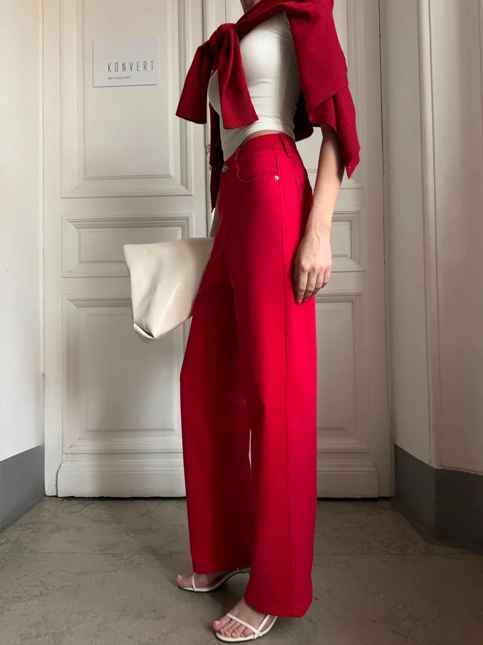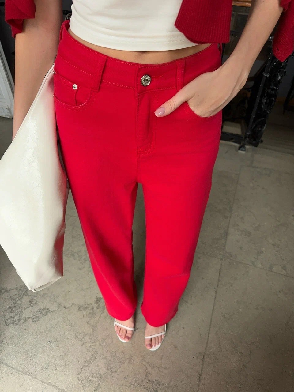Джинсы в красном цвете прямого кроя