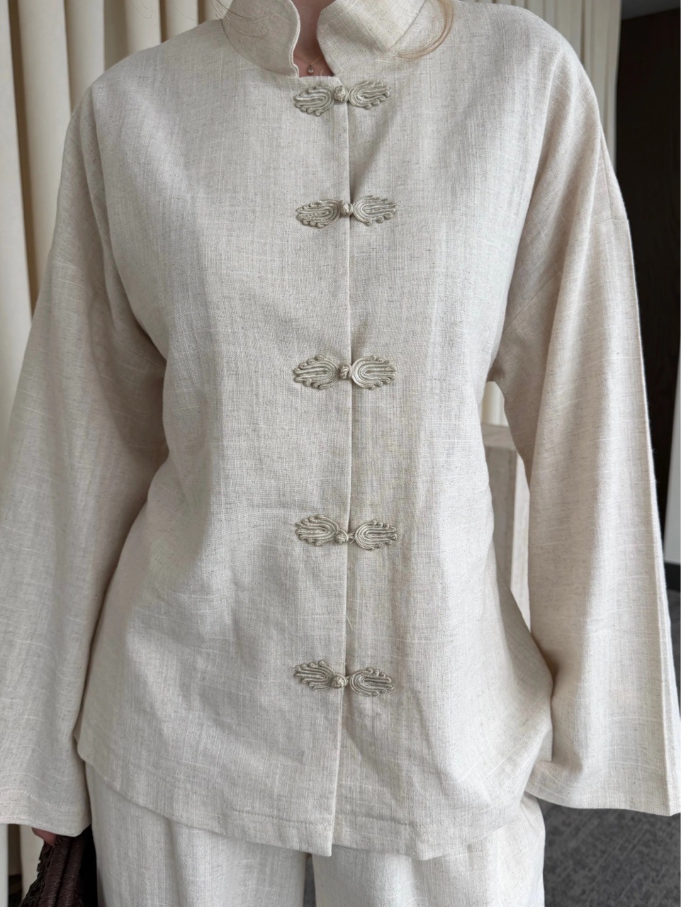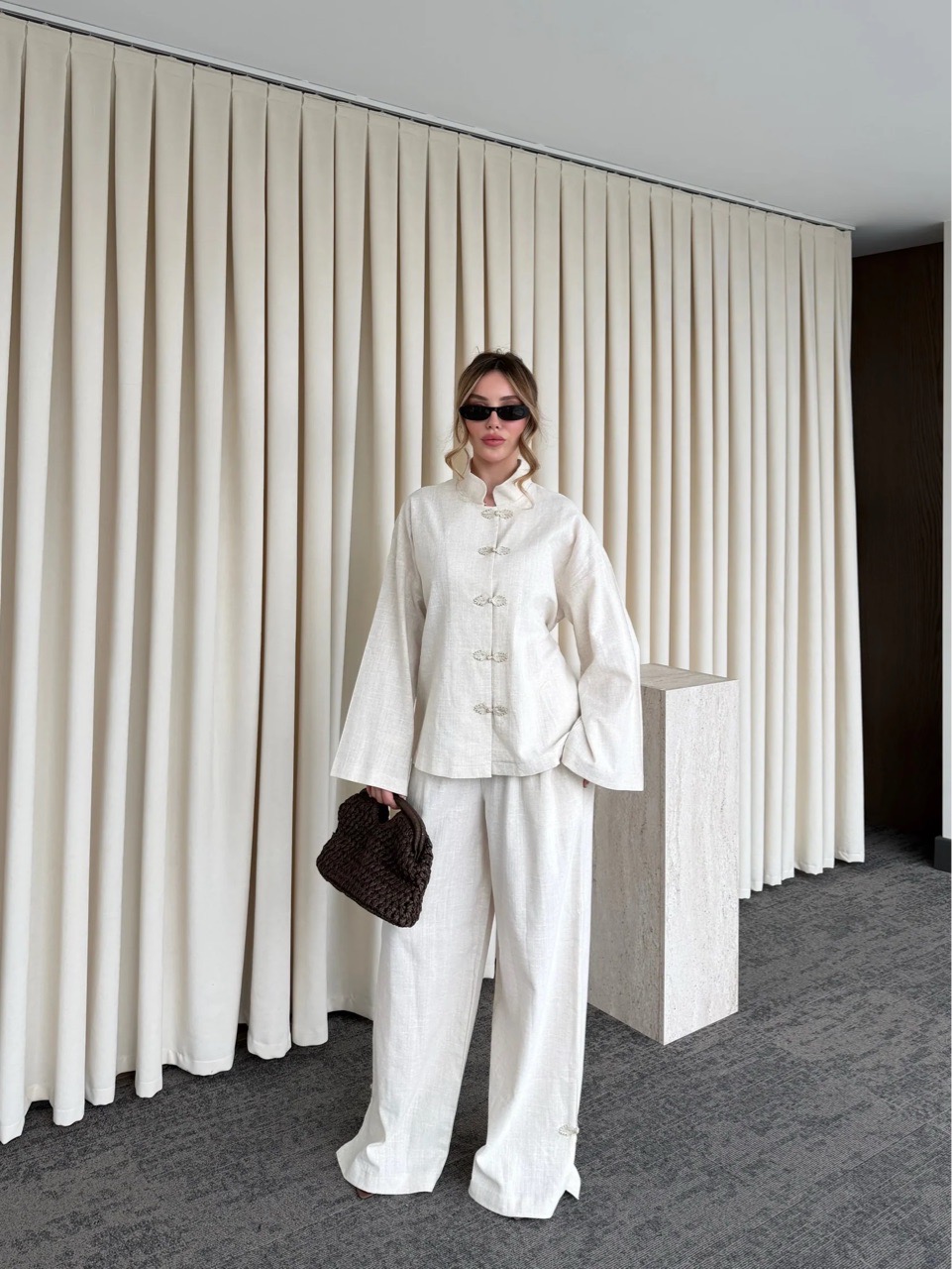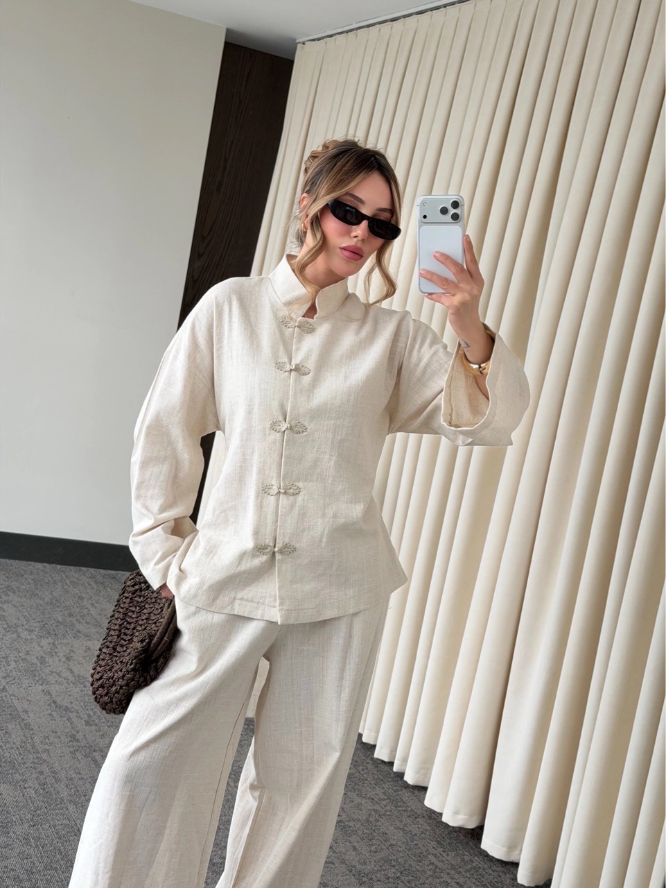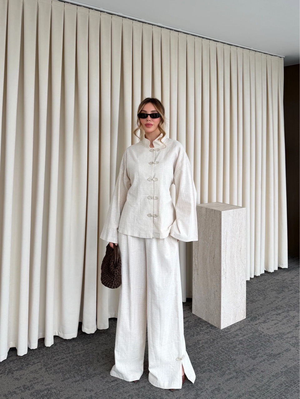 Костюм в азиатском стиле с прямыми брюками и разрезами по бокам
