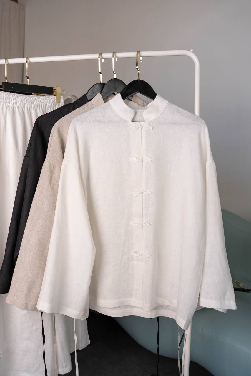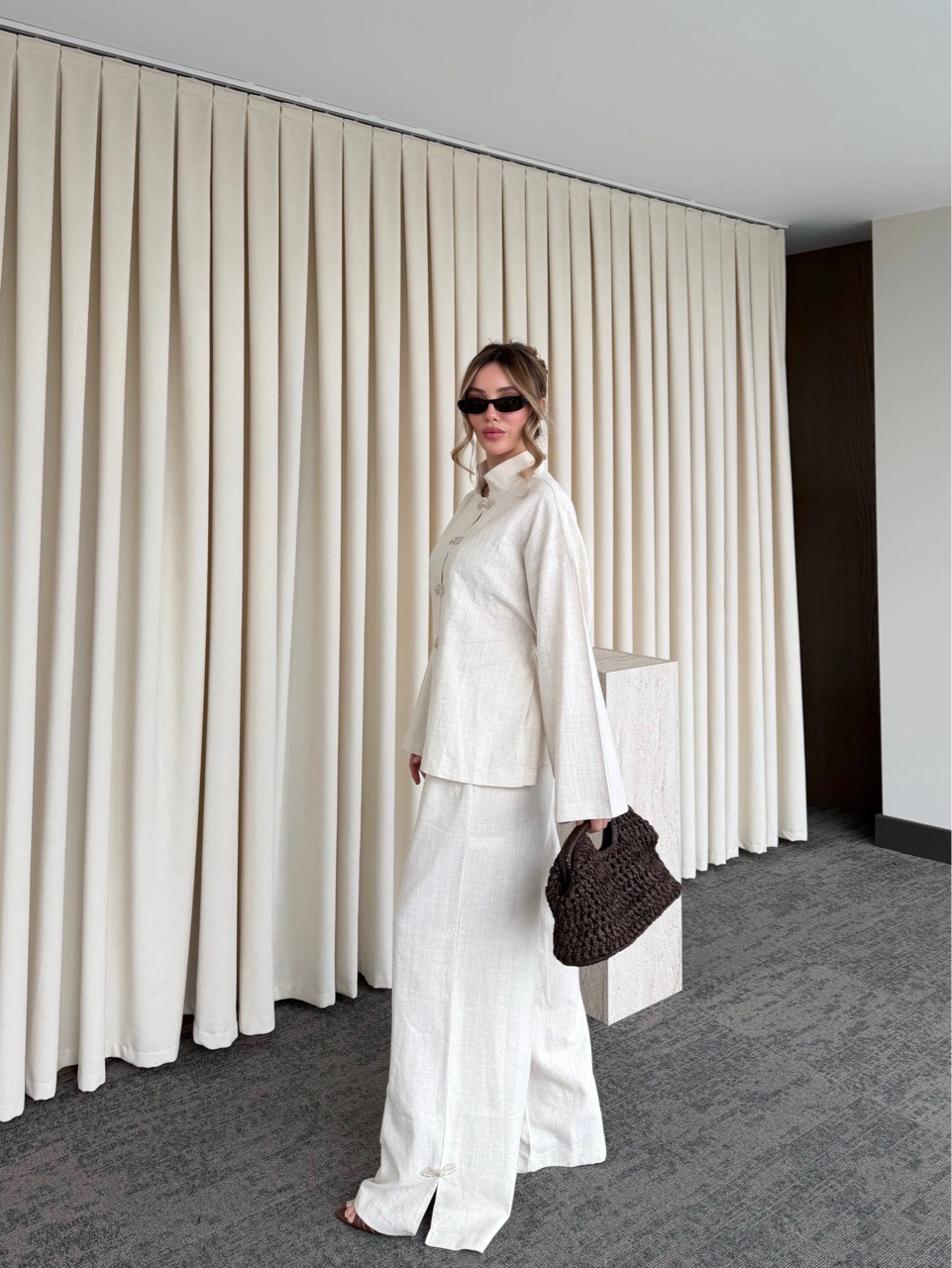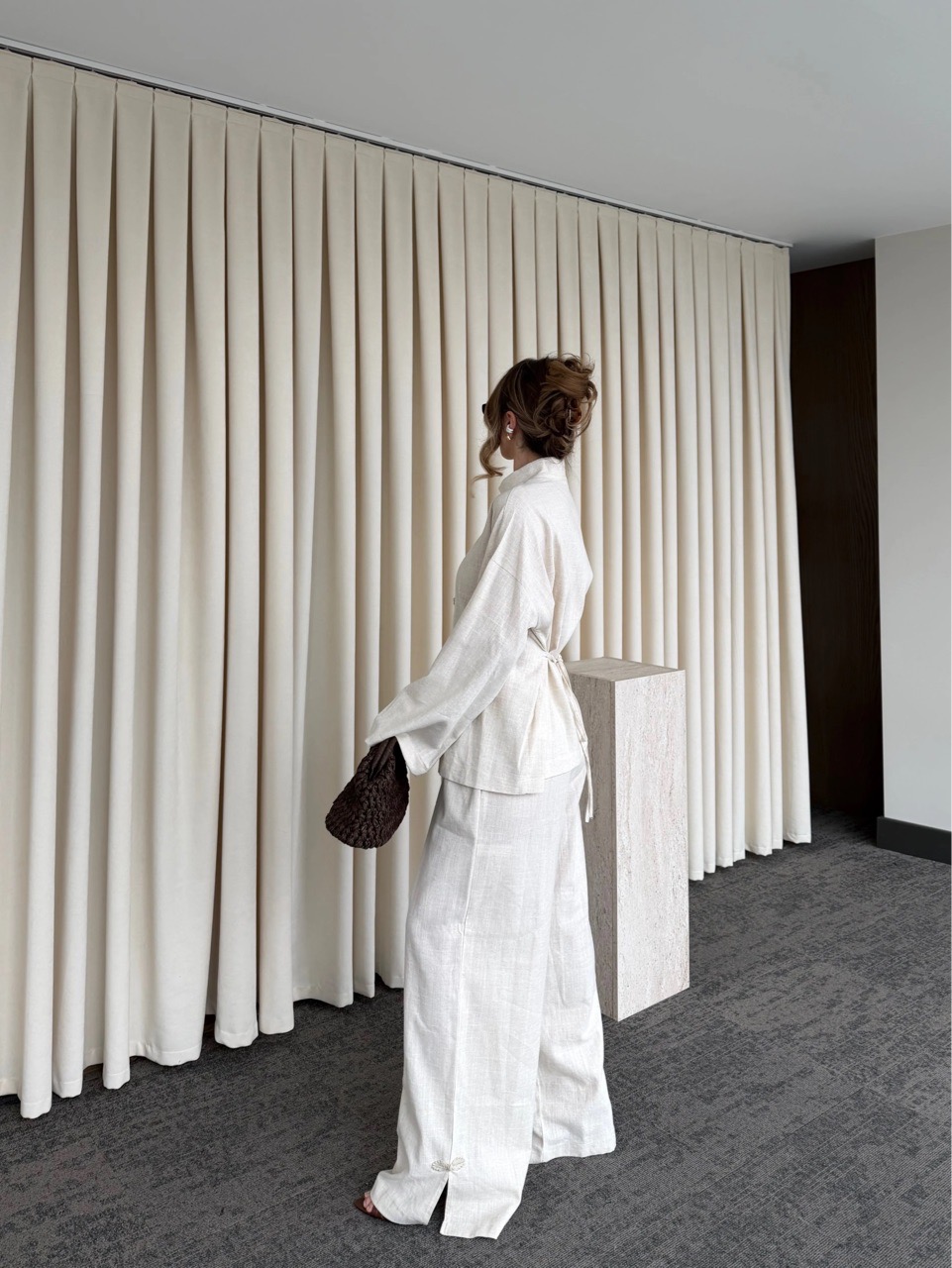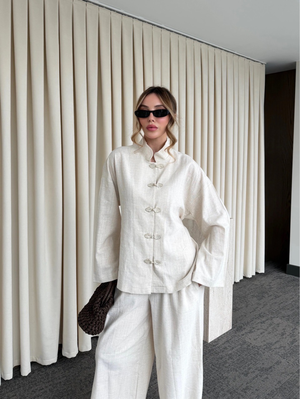 Костюм в азиатском стиле с прямыми брюками и разрезами по бокам