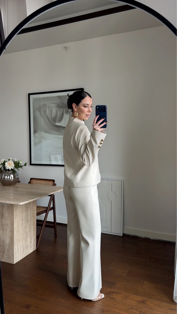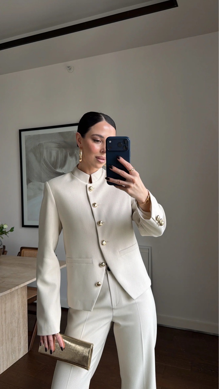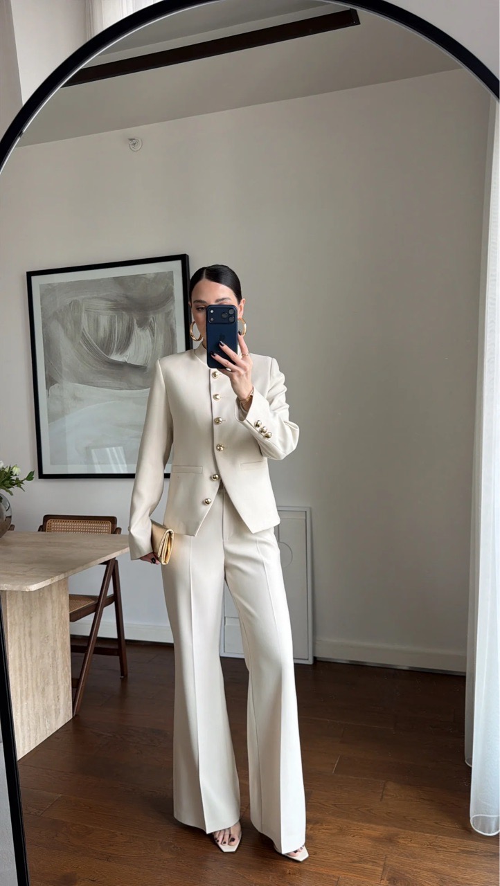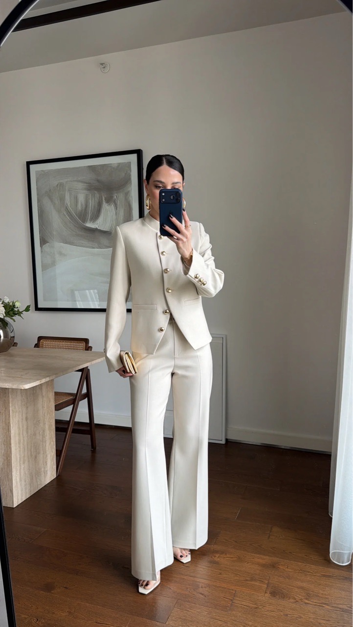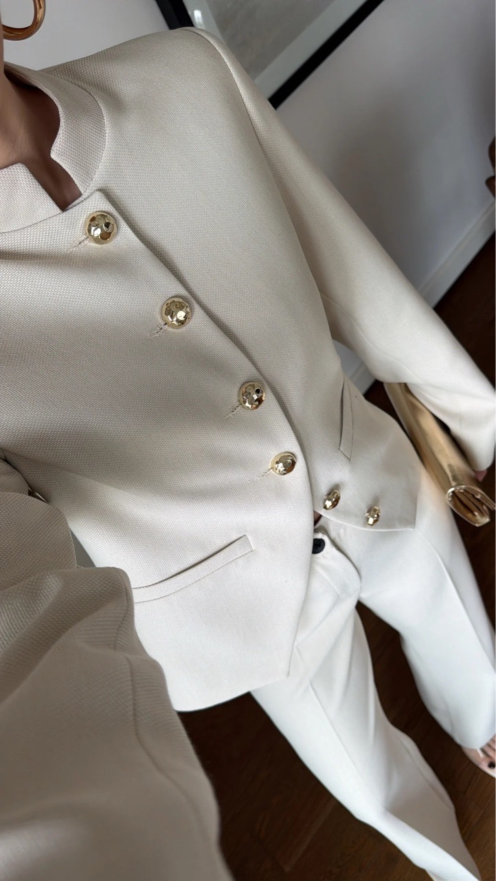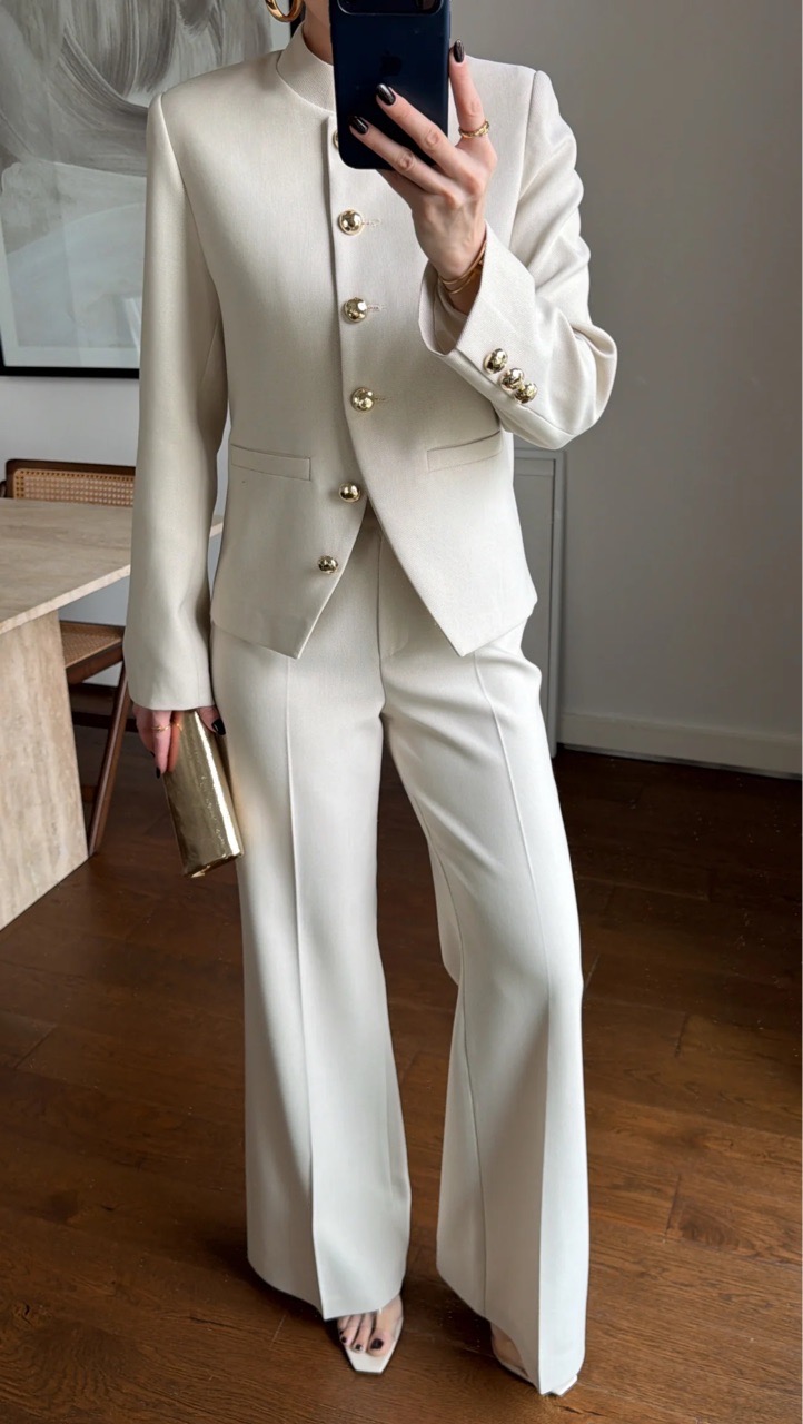 Костюм с жакетом со стойкой воротником и брюками клеш