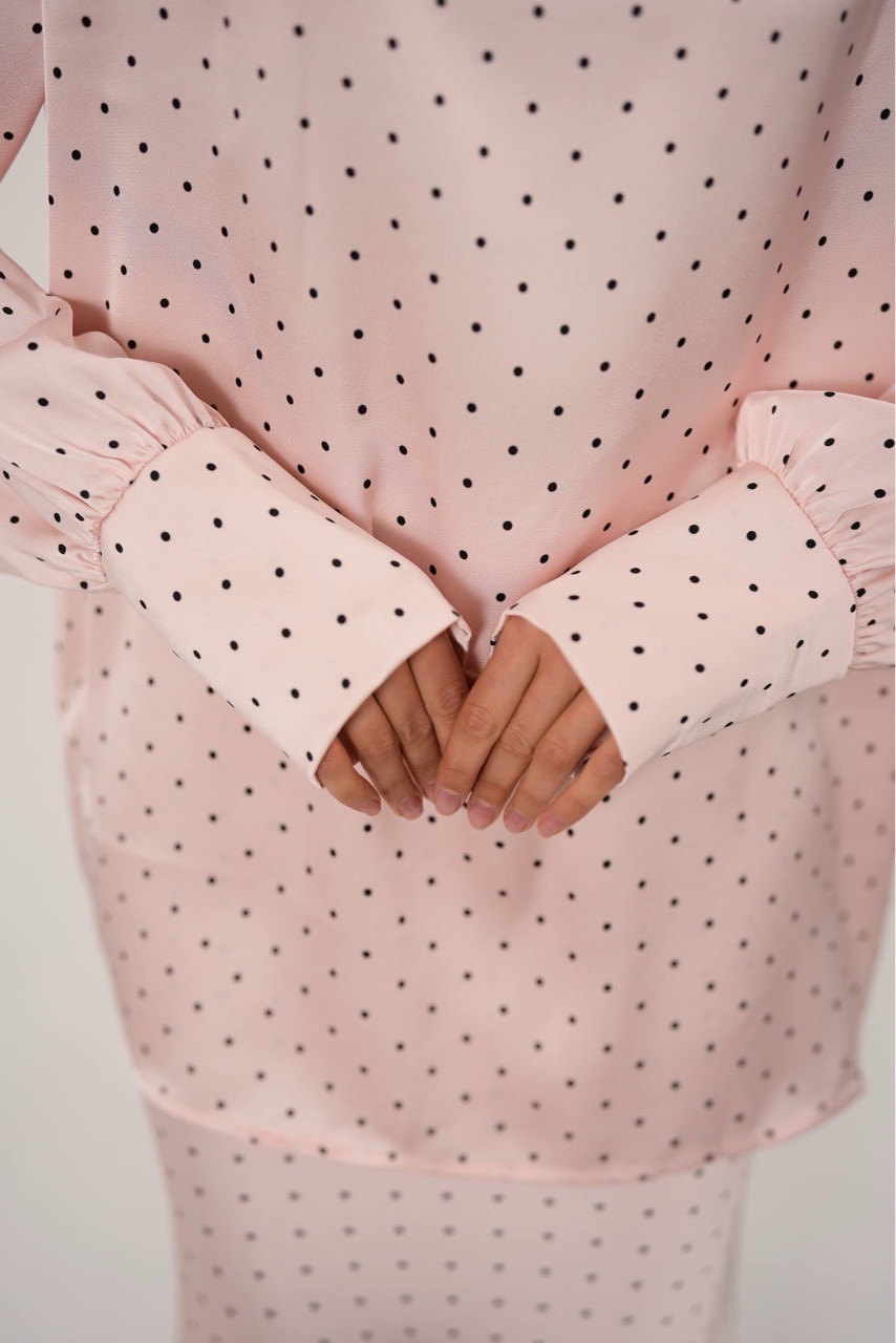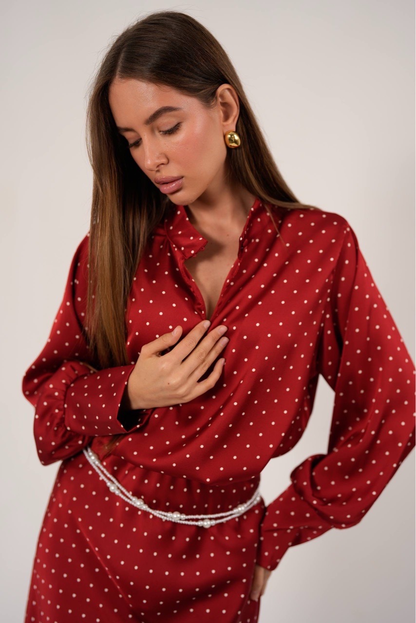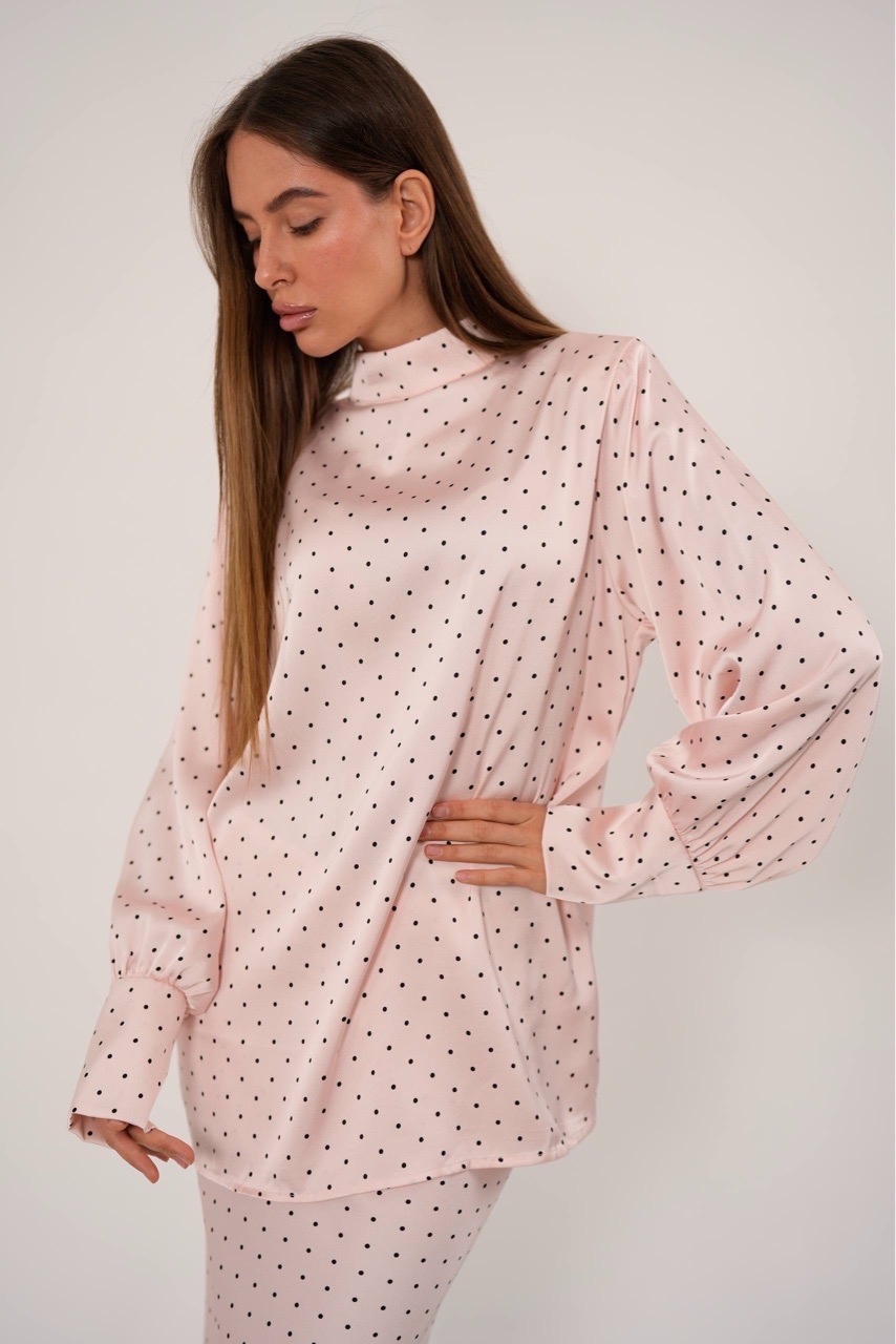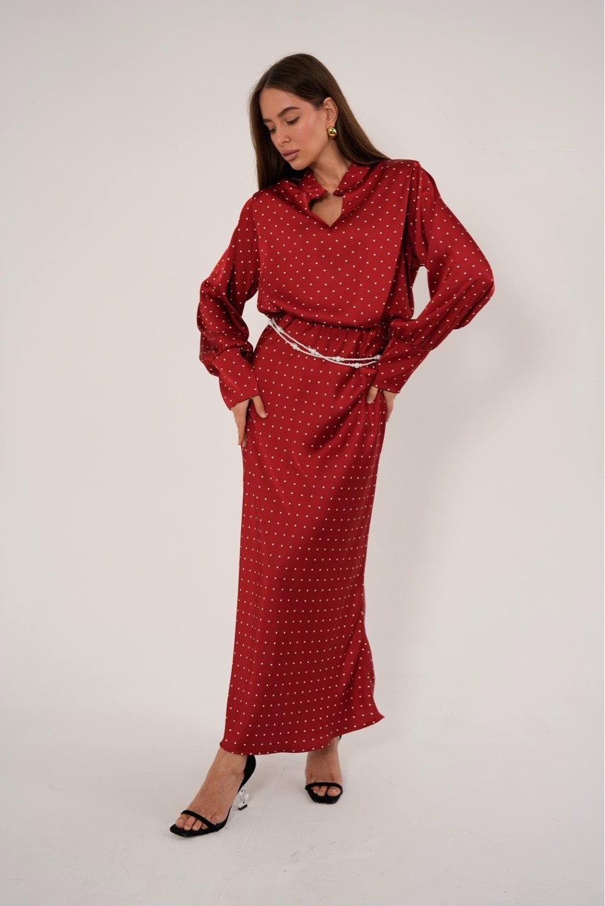 Костюм в горошек с юбкой в макси длине из вискозного шелка