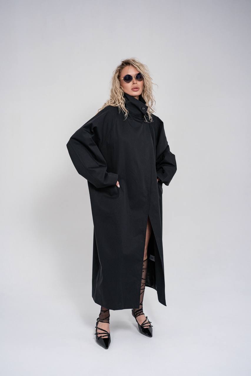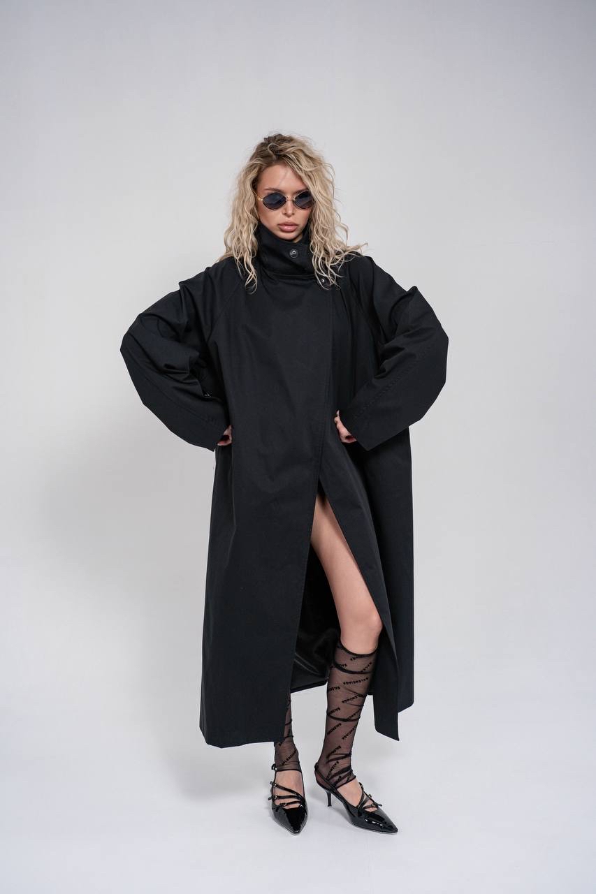 Тренч A-силуэта с высоким воротом из премиальной ткани